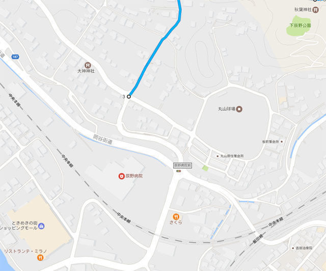 入り口は辰野駅西側にある丸山球場のそば。普通の道路からいかにも狭いですよ~と看板が出ていました。
