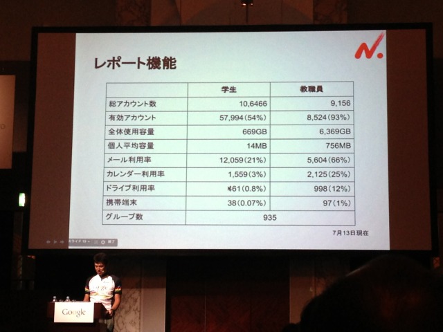 日本で最大規模にAppsエディケーションを利用しているのが日本大学。10万以上の学生アカウントを有する。ドライブを使ったファイル共有でUSBメモリの使用を禁止し、セキュリティにも配慮している。”全ての情報をGoogleに閉じ込めろ!”の方針でAppsを利用している。