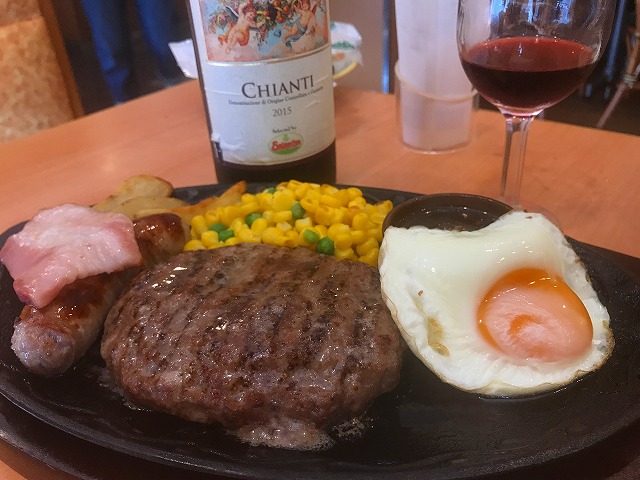 ハンバーグ、ソーセージ、ベーコン、目玉焼きと、楽しめます。赤のキャンティにも合います。
