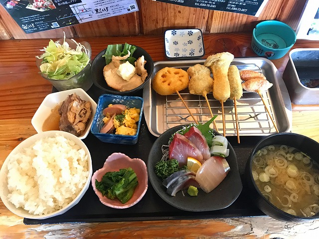 この下にあるもので税込850円。串揚げ定食なのに刺身、煮魚、サラダ、おひたし、などなど付いてきます。
