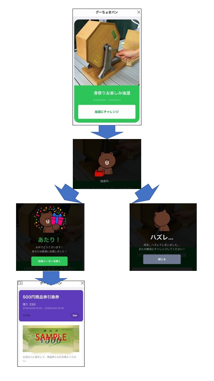 下のフロー図を見てもらえればわかると思いますが、キャラクターのクマのブラウンが抽選するアニメが流れて結果が表示されるといった遊び心あるものになっています。