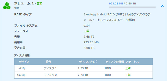 さてDS218Jですが、NAS用のWD製REDシリーズHDDで2重化しています。この2重化のことをRAID1(ミラーリング)といいます。コントロールパネルからも3TBの2台のHDDがグループ化されていることがわかります。