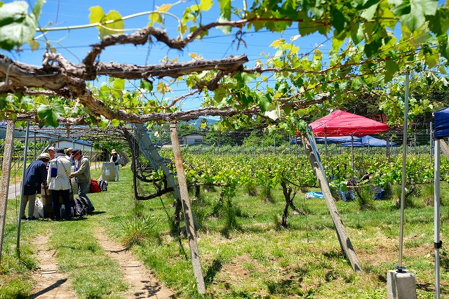 次はアルプスファーム。奈良井川沿いの新しいブドウの圃場で、青空に畑はとても映えます。ここではプチヴェルドという品種を飲みました。初めて聞く品種で、ボルドーでは少量ブレンドされるもので単一で飲んだことがなくて当然です。試験的に作ったそうで、色合いや味はカベルネ・ソーヴィニヨンっぽいものでした。
