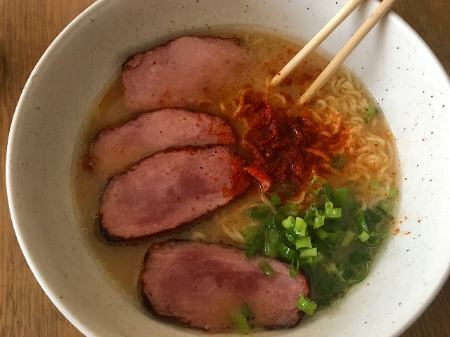 高いラーメンなのでチャーシューを用意してトッピング。まずはスープを一口、濃厚な豚骨スープで美味しいです、さらに秘伝の赤い粉をかき混ぜると辛味が出てこれこれ!この味!ってなりました。