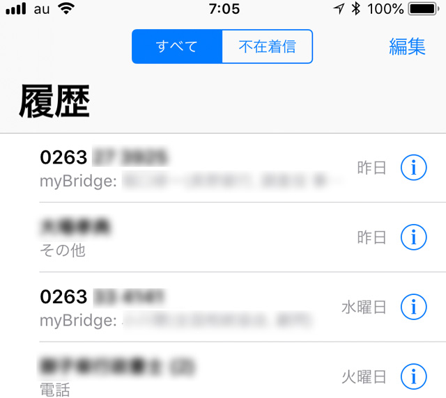 また便利なのでが、myBridgeに登録されていれば着信時の表示や履歴にその旨が表示されます。いちいち名刺データを連絡先にエクスポートしなくて済みます。