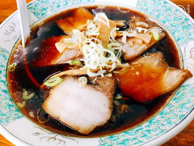 出てきたのが写真のような真っ黒い醤油ラーメン。見た目ゲゲ!っと思いましたがスープを飲んでみると見た目とは違って柔らかい醤油味。コシのある縮れ麵にスープが絡んでシコシコ美味しい。