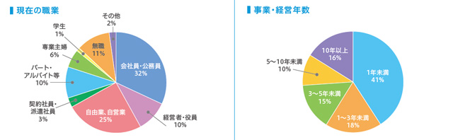 受講生の属性としては、男女比がほぼ半々、年代は20代、30代、40代が均等になっています。現職はサラリーマンというのが32%、自営業で25%、専業主婦も6%となっています。僕が担当させていただいた創業スクールも10名の参加者の分布もほぼ同じようなものでした。