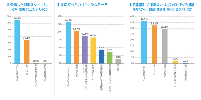 創業スクールに参加しての感想は「大いに役に立った」「役に立った」でほぼ100%。特にビジネスプラン作成はよかったみたいです。