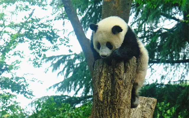 シャンシャンは木登り中、シンシンは大勢の観客の前でのんきに笹を食べていました。リーリーは台座の下に潜り込んでます。