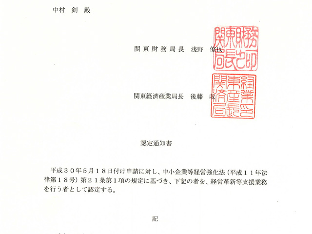 6月29日付けで認定された「経営革新等支援機関」の認定通知書が送られてきました。