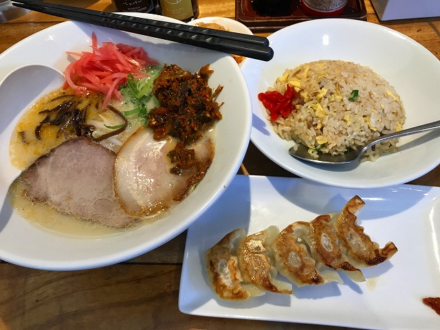 写真でみるとかなりのボリュームになります。辛子高菜、辛子もやしはトッピング自由なので満足のいくラーメンセットです。