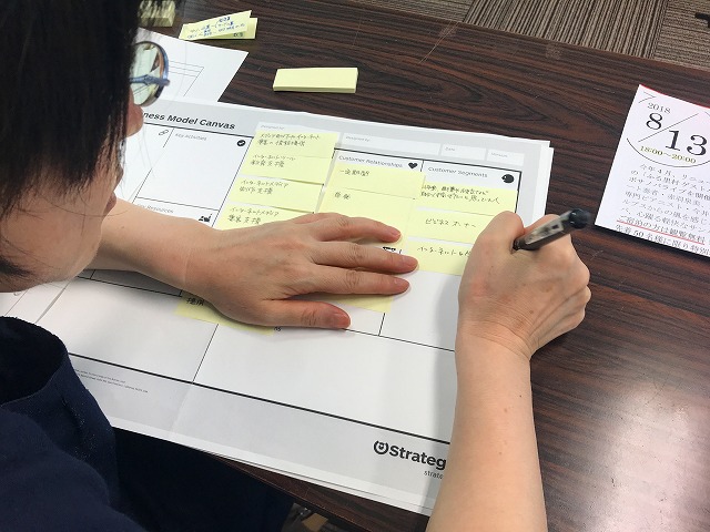 受講生面々が、自分の事業のBMCを書いてもらい発表し合いました。初めて描くBMCですから不出来なのは当然です。仲間に説明することでわかっていないところが自覚でき、仲間からのアドバイスをもらうことで新たな視点を得ることができます。