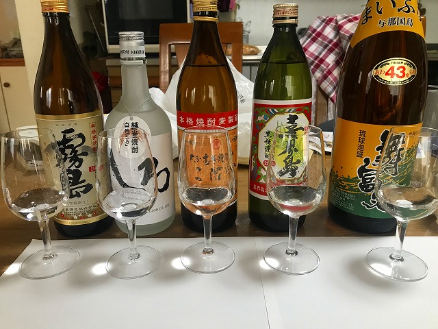 僕が揃えたのは左側から、芋焼酎、米焼酎、麦焼酎、黒糖焼酎、そして泡盛です。