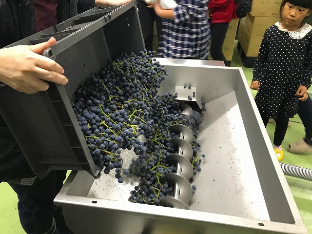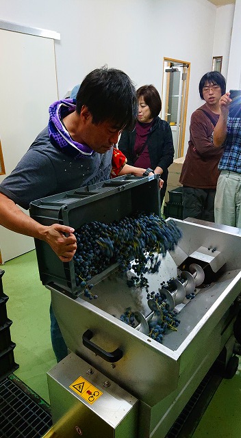 午後からは醸造体験ということで、除梗・破砕を体験。機械に収穫したぶどうを入れ込んでいくと、上手にぶどうの実と実梗にわかれていきます。
