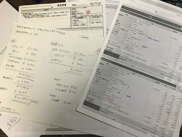 乗り換えると、auの違約金のサポートや家族3台での割引、端末下取りでの割引などいろいろな割引が適用されます。一店舗だけだとわからないので、さらに2店舗回って、ソフトバンクとドコモへ乗り換えた場合を試算してもらいました。