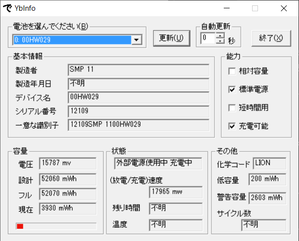 バッテリーを専用ソフトで調べてみると、設計要領52260mWhがフル充電で29170mWhとの56%まで落ちていました。