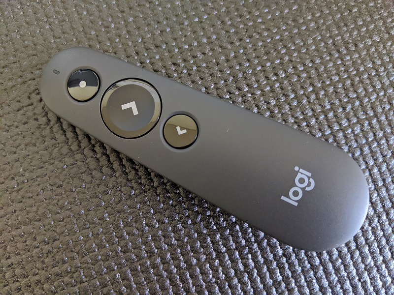 初購入なので5000円クラスでシンプルなものを選びました。ロジクールのR500です。同様の値段のR400tの方が一般的で売れてるみたいでしたが、①見た目のシンプルさ(ボタン3つのみ、電源スイッチもない)、②bluetooth接続20m、③バッテリーでなく電池式、が選択の決め手です。
