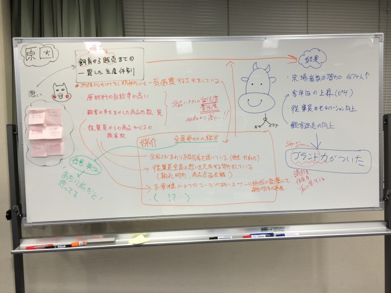 これらの話をもとに各班にわかれてグループワークを行い、丹後ジャージー牧場さんの原因〜媒介〜結果、をまとめていきました。