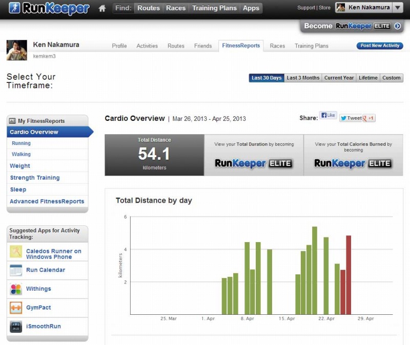 無料アプリでありながら、必要十分以上の機能を有しています。利用モードが、ランニングやウォーキング、スノーボードなど十数種類あります。僕はランニングモードでしか使っていませんが、GPSによる走った場所の地図表示や平均速度、消費カロリーなどがロギングされます。ホームページではさらに高低差も表示され、ランニングという行為の様々なデータが可視化され、やる気を起こさせます。