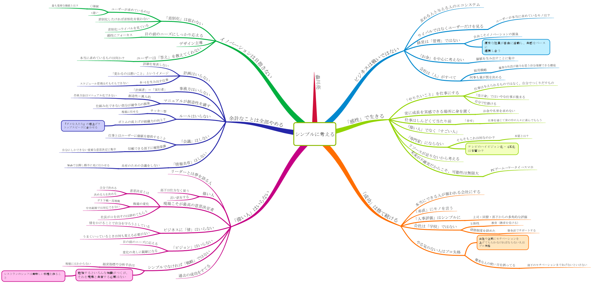 これらのコトバの表面だけを捉えると過激ではありますが、「仕事とはユーザーに価値を与えること」「現場こそが最高の意思決定者」「権限委譲をして本当にやるべきことに専念する」など、「シンプルに考える」ことの重要性を説いています。