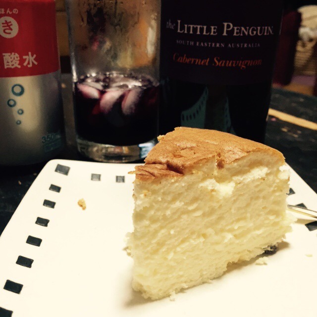 スフレタイプのチーズケーキなので口に入れるとすぐにとろけます。それが少し残ってる状態で赤ワインを流し込むと、ワインのタンニンが引き立って、ほろ苦く大人の味になりました。