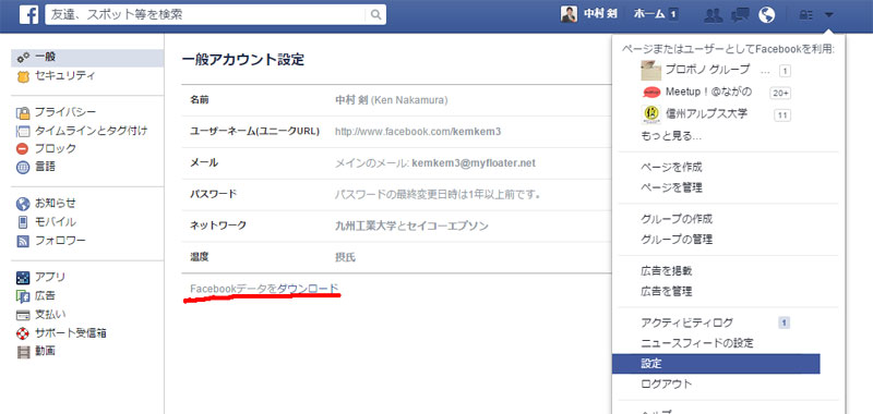 今年を振り返る Facebookデータのダウンロード 12月 18, 2015 中村 剣 コンピューター, ブログ No comments yet 今年も残すところ2週間となりました。 みなさんはどんな2015年だったでしょうか? きっとFacebookにもたくさん投稿さたんじゃないかと思います。 実はFacebookのデータってダウンロードできるってご存じでしたか? 投稿や写真がローカルのパソコンで見ることのできるHTMLファイルでダウンロードできるのです。 「設定」の「一般」の画面の一番下に小さく、 Facebookデータをダウンロード ってあるんです! 年末、Facebookデータをダウンロードして今年を振り返ってみませんか?
