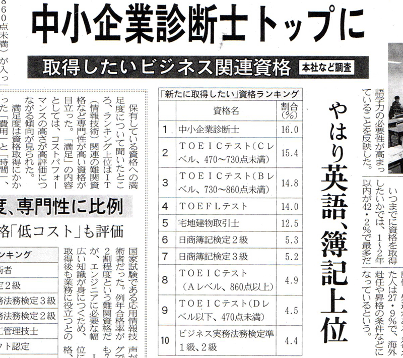 いろんなみなさんも紹介されていますが、1月12日付け日経新聞に「取得したいビジネス関連資格」という記事が掲載されています。