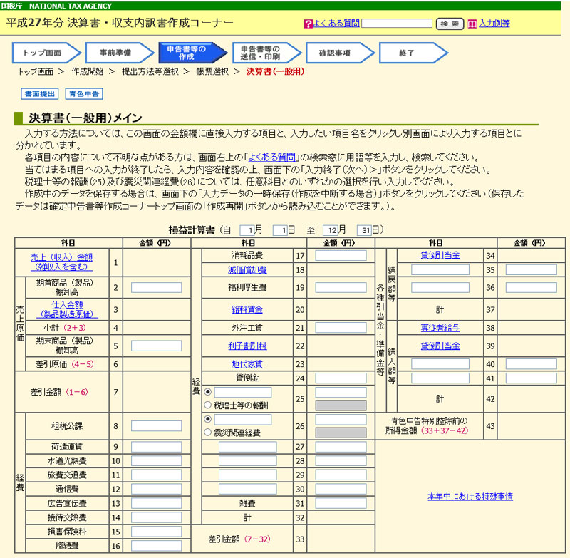 やはり「確定申告書等作成コーナー」を使うには、前もって損益計算書や貸借対照表を作成しておく必要があります。これらの作成は会計ソフトに任せるのがラク。会計ソフトを使っているのであれば、青色申告決算書等は自動作成してくれるので、そもそも「確定申告書等作成コーナー」を使う必要がありません。