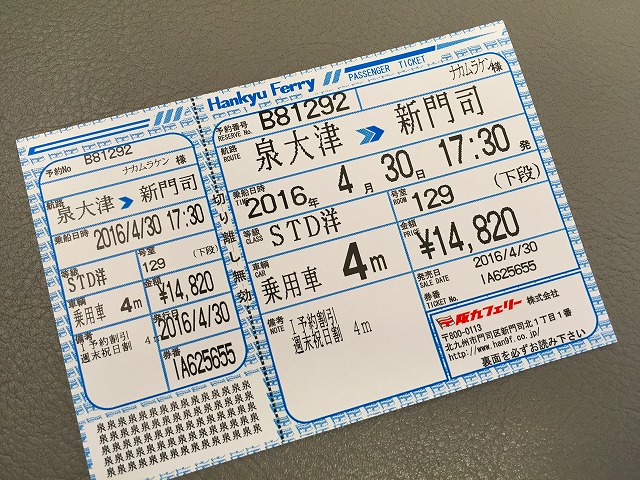 大阪~門司までを結ぶ阪九フェリー。子供の頃からテレビCMで知ってはいましたが乗るのは初めてです。大阪17:30出港、門司には翌朝6時着の約12時間の船旅です。