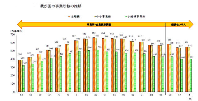 事業所の数の時系列推移を示したのが上のグラフで、1981年までは上昇しそれ以降は減少に転じています。小規模事業者も1989年の509万事業所をピークに2014年は401万事業所と100万も減少しています。