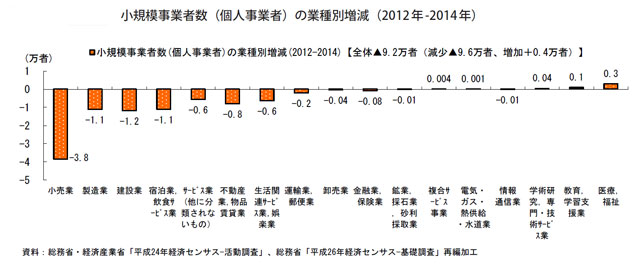 2012年から2014年にかけて、小規模事業者の内、個人事業者は事業者数で9.2万者、従業員数で42万人も減っています。