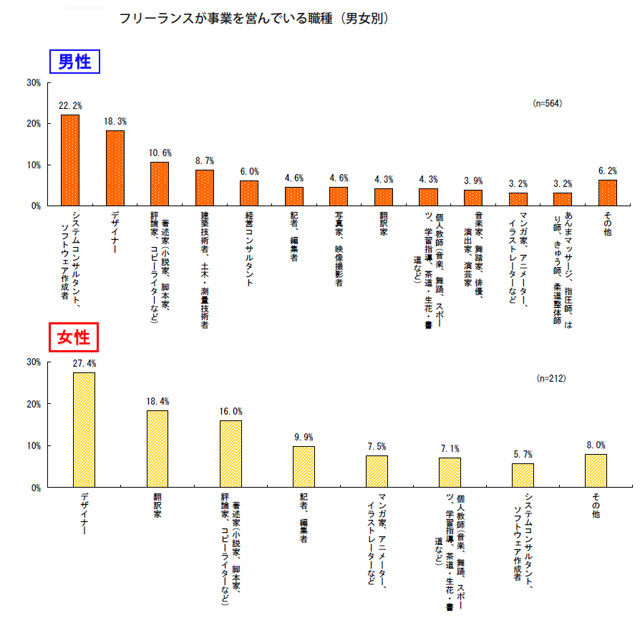 フリーランスの職種をさらに深掘りしたのが、この男女別のグラフです。