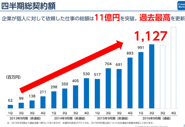 その1つクラウドワークスの決算資料(2016年9月期第1四半期)からとても面白い現状をみることができます。