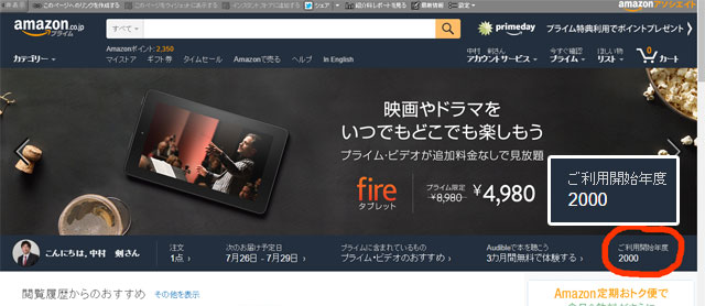 ???これって2000年から僕がAmazonを利用してるってこと?と思い、アカウントサービスの購入履歴をプルダウンしてみると確かに確かに2000年からの購入履歴がずら~と出てきます。