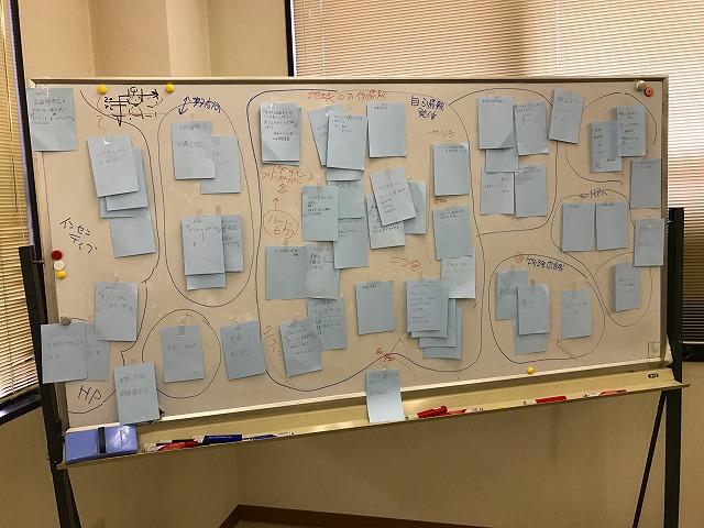 すると写真のように解決案ごとのグループができあがります。全体を俯瞰すると、そもそもの課題に直接的に効きそうなもの、間接的なもの、抜けてる範囲などがわかります。