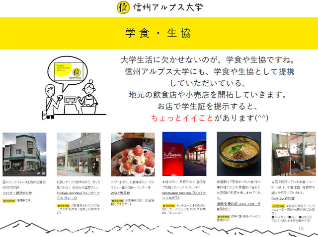 その学生証を提示すると少しイイことがあるお店さんを加盟店として登録させてもらい、学食・生協と呼んでいます。