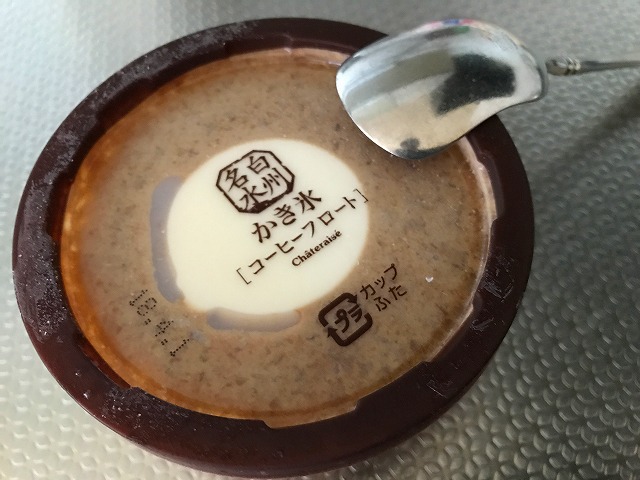 シャトレーゼのコーヒーフロートは、ちょいほろ苦いコーヒー味のかき氷に真ん中にアイスクリームが入っている定番商品。