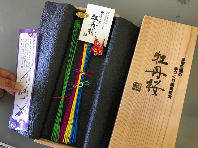 訪問先で見せていただいた高級日本製の線香花火。桐箱入りで5000円以上だそうです。