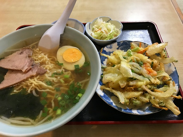 あっさりしたラーメンに野菜のかき揚げが付いてきます。
