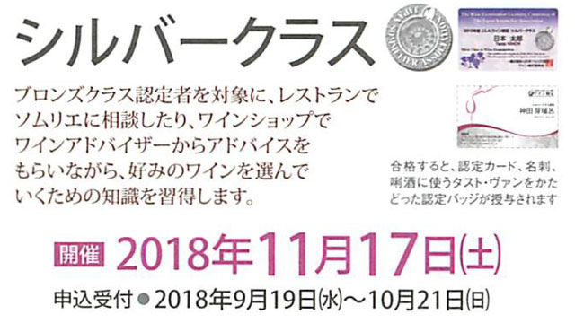 ワイン検定とは、日本ソムリエ協会がワイン初心者向けにワインをもっと知ってもらおうという検定で、入門編のブロンズクラスと中級のシルバークラスがあります。