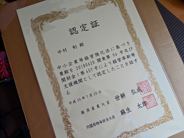6月29日付けで経営革新等支援機関の認定を受けたのですが、その認定証が届きました。