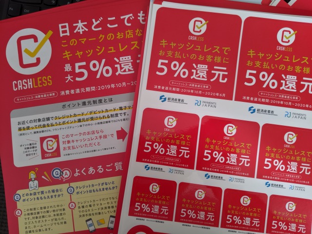 赤いポスターのある加盟店(主に小規模事業者)でキャッシュレスで購入すると、最大5%が還元されるというものです。
