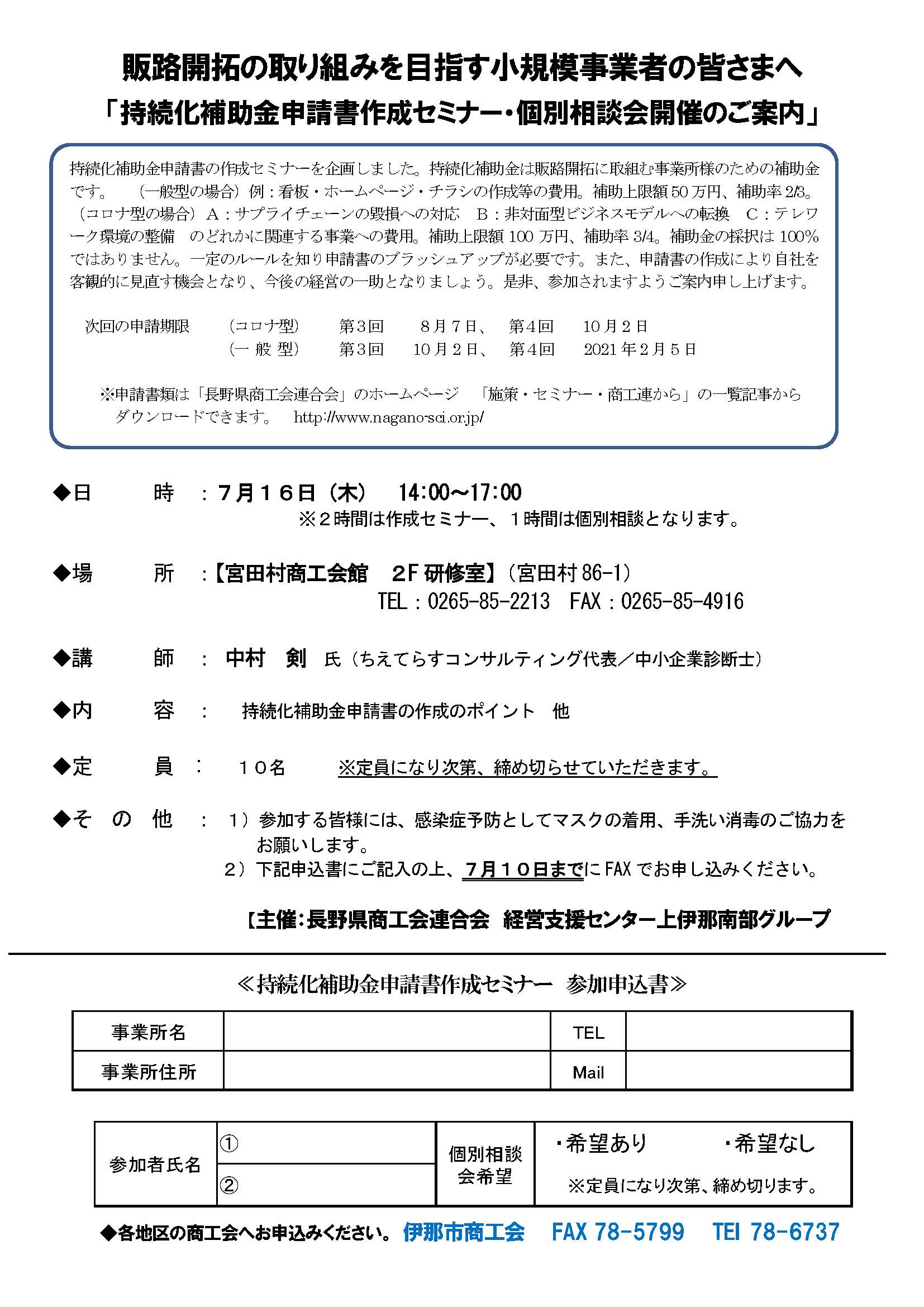 7月16日(木)に宮田村商工会館で「小規模事業者持続化補助金作成セミナー」を開催します。