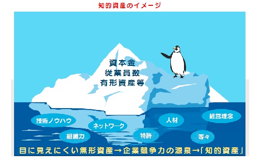 企業等の競争力の源泉としての人材、技術、技能、知的財産(特許、ブランド・・)、組織力、顧客との関係性など、財務諸表に現れてこない資産を総称して知的資産といいます。