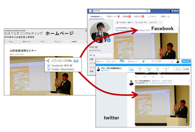 ホームページで更新したブログの内容が自動的にFacebookやtwitterに投稿されます。同じ内容を何回も投稿する必要はありません。SNS連携であなたとあなたの顧客との関係性を高めます。